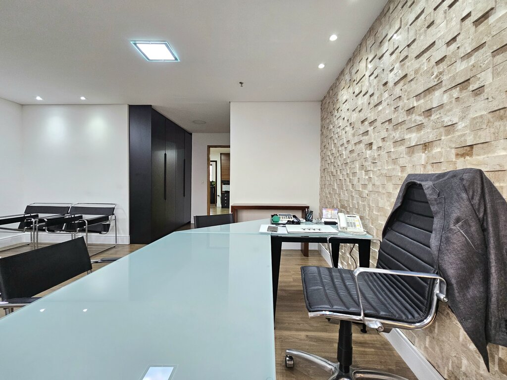 No espaço foram feitas 5 salas independentes, sendo uma ampla sala de diretoria com espaço suficiente para uma mesa de diretor, além de uma sala de reunião exclusiva e um banheiro privativo.
