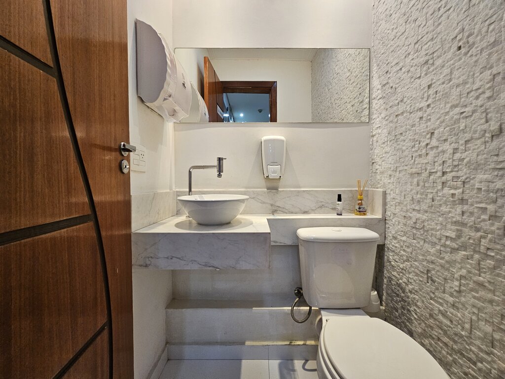 A configuração atual inclui uma sala de recepção com 2 banheiros (masculino e feminino), além de uma copa e cozinha bem iluminadas e ventiladas.